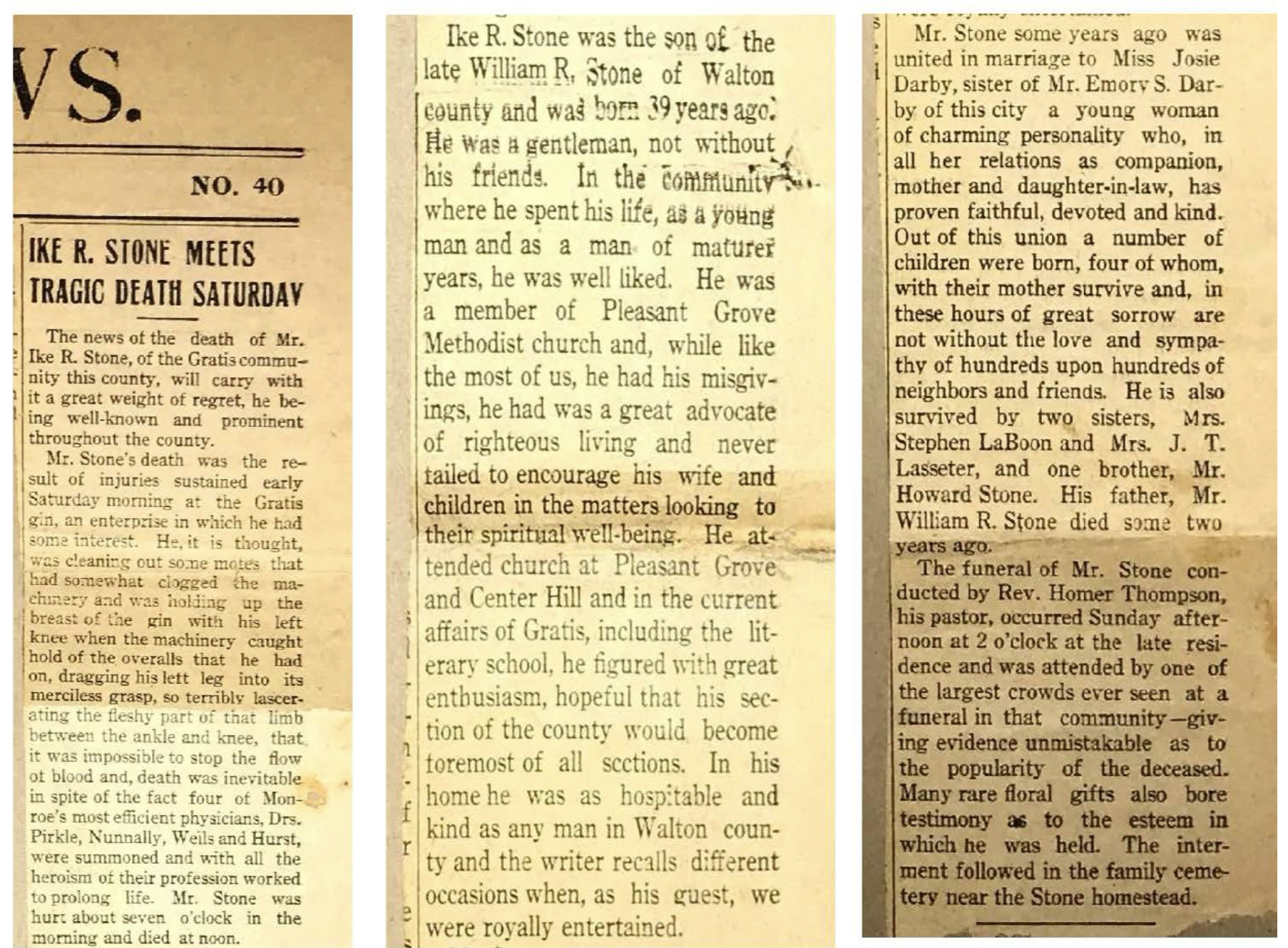 Mr. Stone “had some interest” in the Gratis Cotton Gin and sustained fatal injuries when his overalls were caught in the cotton gin machine as he was trying to clean it out. Unable to stop the flow of blood from the lacerations, even the best doctors in Monroe could not save him.