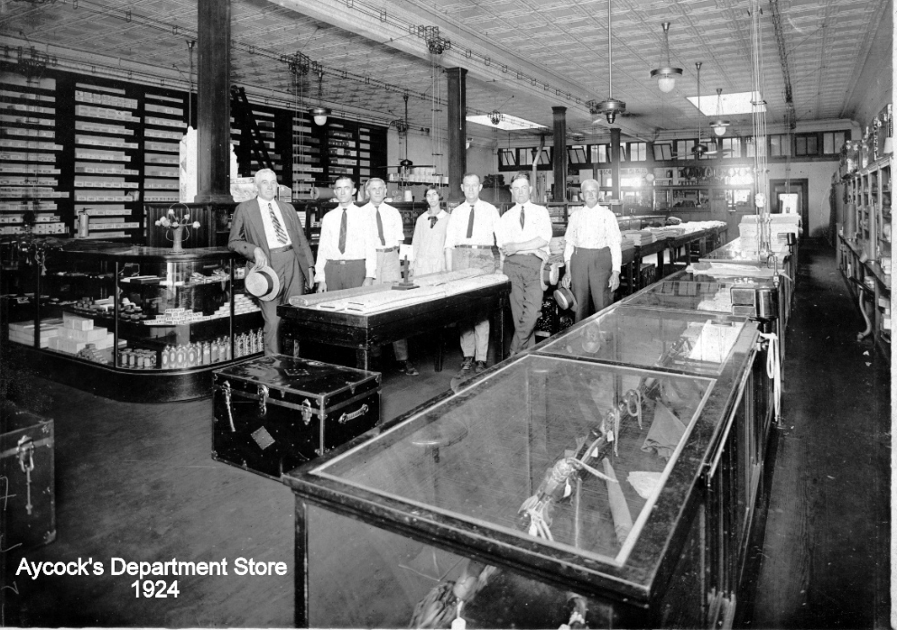 Aycock’s Department Store was open at this location as early as 1915 and continued in business until 1960. John and Earl Aycock sold most everything. Clothing and dry goods were located upstairs, while groceries and farm supplies were stored downstairs. They also sold wagons.